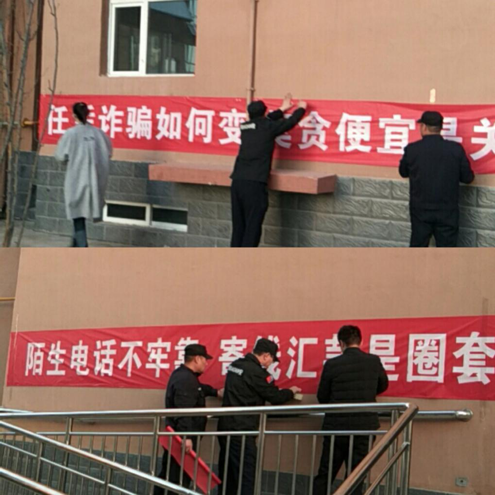 在豐源居小區(qū)組織物業(yè)人員懸掛防范電信詐騙條幅、樓道張貼防范電信詐騙相關(guān)內(nèi)容,挨家挨戶進(jìn)行宣傳講解,通過多種方法使大家的防騙意識入腦入心,減少案件發(fā)生,保障群眾的財產(chǎn)安全。